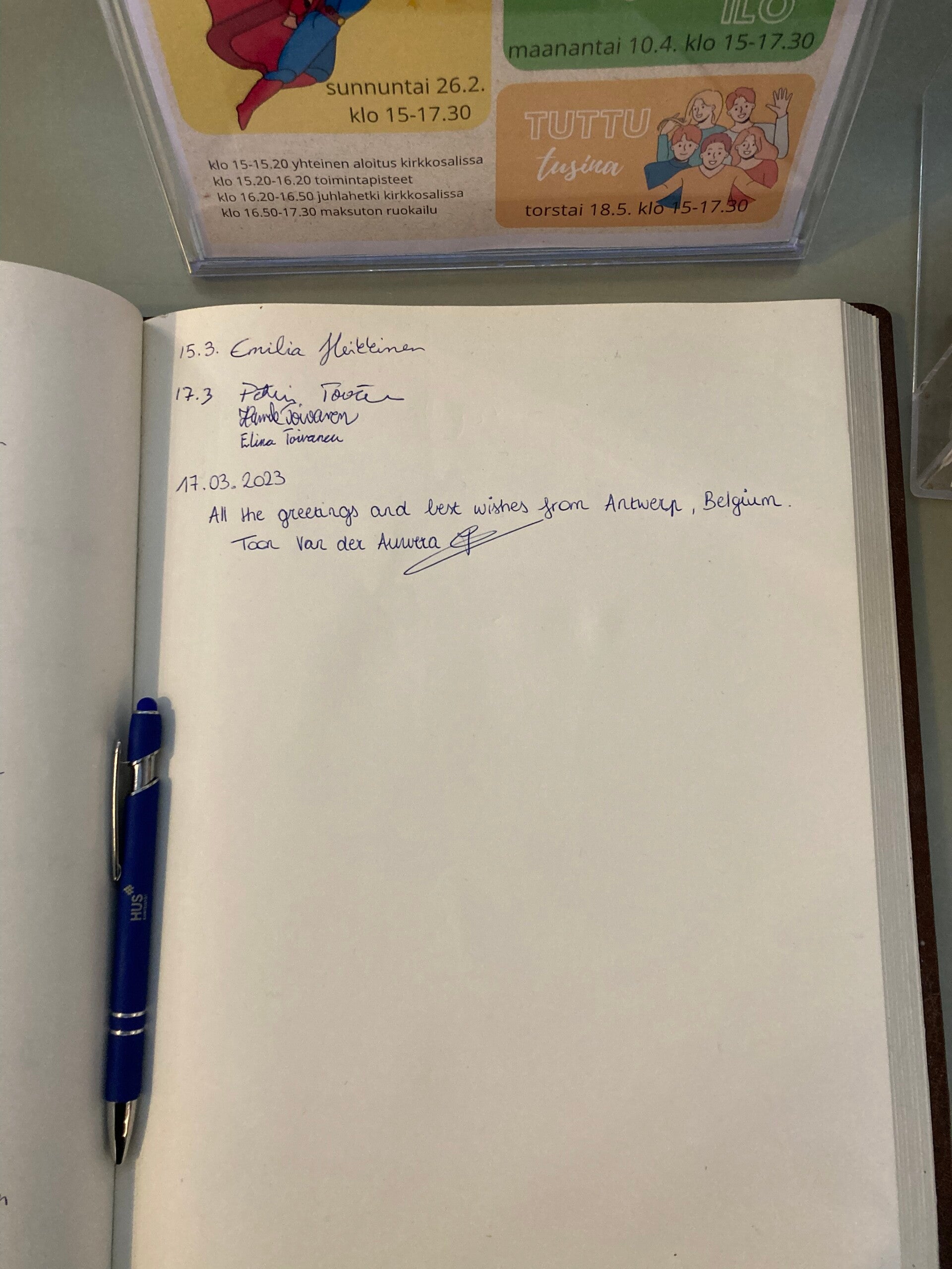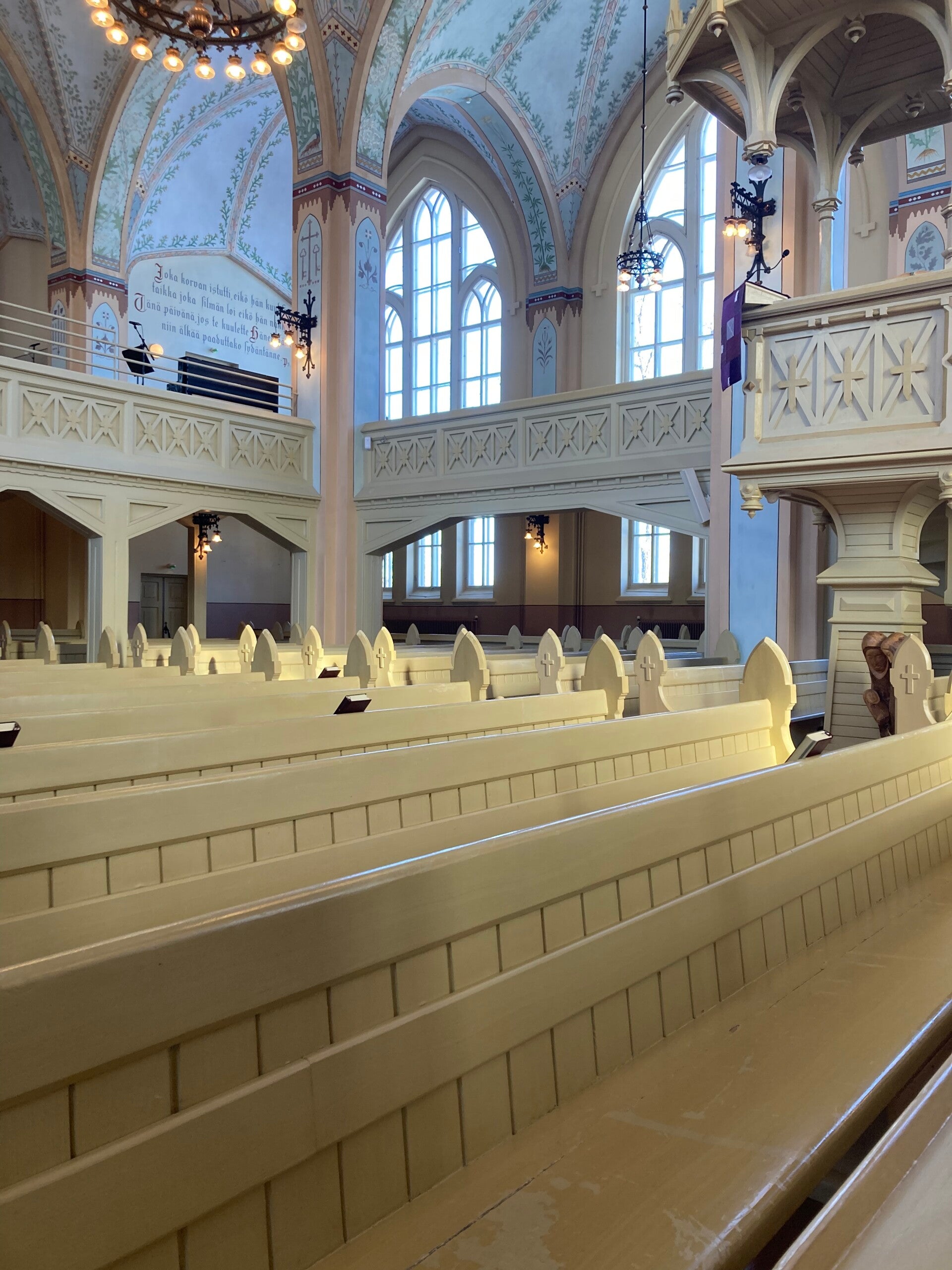 Story time. Ik kom aan bij de kerk na een goede wandeling, ongeveer iets na de middag. In de vertrekhal hangen heel wat jassen, hoeden en andere kledingstukken tegen de kou. Ik weet niet goed wat ik moet verwachten. Ik wandel de dubbele deur door, recht een trouwceremonie binnen. Een échte Finse trouw. Met moeite hield ik mijn kin omhoog. Na vlug en stijlvol uit de middengang te wandelen, volgde ik de prachtige ceremonie tot het einde. Na een klein uurtje wandelde het koppel naar buiten, en kreeg ik de kans om de kerk vanbinnen eens grondig te bekijken. Na heel wat lezen overal, foto’s te nemen, te genieten van de stilte en de live-spelende organist (super toffe mens trouwens) kwam, of all people, het koppel terug binnen met de fotograaf. Ik wist hen te ontmoeten, mijn beste wensen te geven en de bruigdegom zijn waanzinnige kostuum uit vilt eens te bekijken. Prachtige ervaring. Ik liet ook een boodschap na in het kerkboek. Hierna wandelde ik verder door het aangevrozen landschap.